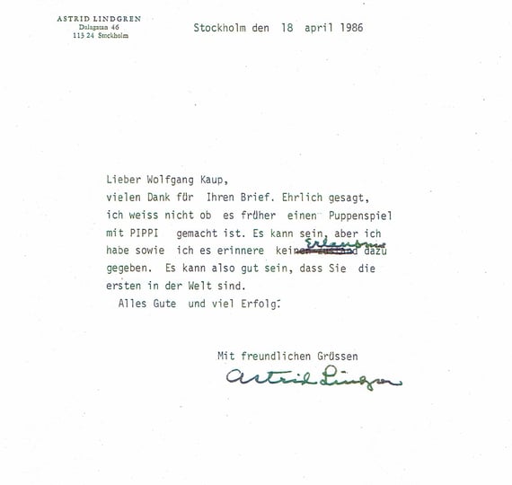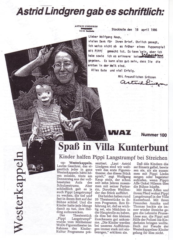 Astrid Lindgren bestätigte dem Künstlerpaar Dorothee Wellfonder und Wolfgang Kaup-Wellfonder (= Wodo Puppenspiel) 1986, dass sie das erste Figurentheater weltweit waren, welches sich wagte, Lindgrens Pippi als Puppe/Marionette auf die Bühne zu bringen.